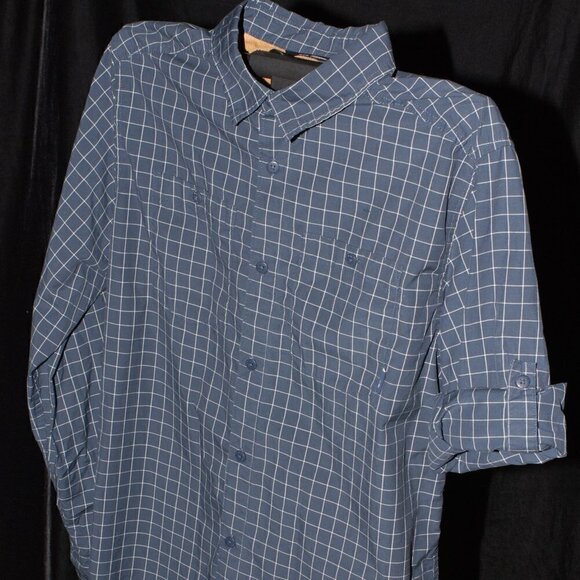 The North Face Men's L Large Blue with white plaid button down collared dress shirt with mesh on the inside back for ventilation. Breathable and adjustable sleeves from full length to short sleeve with a button. One button appears to have been resewn onto the garment with the wrong string color, but otherwise it is in like new condition. It comes with two extra buttons. Two front pockets with button closures. The approximate measurements of this item are: 31" shoulder to waist, 23" pit to pit, 18" neck and 22" arm inseam. If you have any questions please feel free to ask.