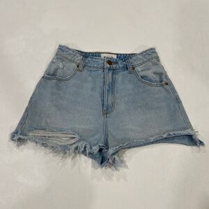 Rolla’s “Dusters” denim shorts in a light wash, size 25 (Aussie 7). Features high rise relaxed fit, distressed details, and raw hem cutoffs. Rolla’s is known for their vintage-inspired denim with modern fits, making these the perfect summer staple. Easy to style with tanks, tees, or crop tops.