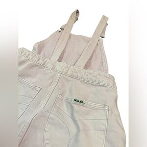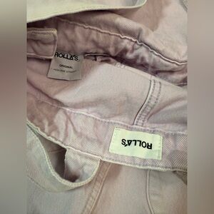 The Original Rollas overall in comfort rigid denim is featured in a soft purple wash with tonal stitching, faded silver trims, cross back detail and classic back pocket.