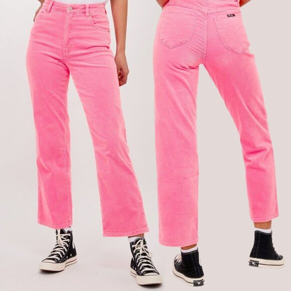 Tags: Rollas jeans, pink corduroy pants, high-rise denim, slim-fit jeans, statement pants, Barbiecore fashion, casual style, everyday essentials, versatile fashion
