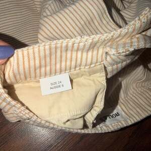 Rolla's Old Mate Pant in Gold Stripe, Women's Size 24. These stylish trousers feature a high-rise waist and a classic straight or slightly flared leg silhouette. Designed with a timeless gold and off-white vertical stripe pattern, perfect for a vintage-inspired look.