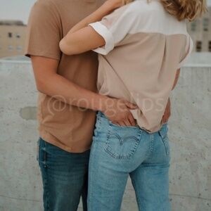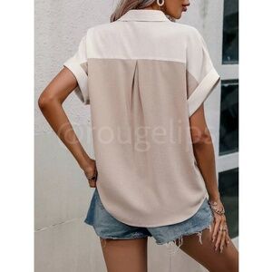 Rolled Up Batwing Sleeves Color Block 2 Tone Button Down Shirt Tan Beige