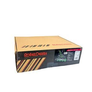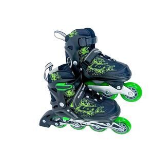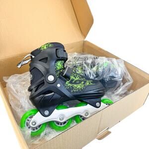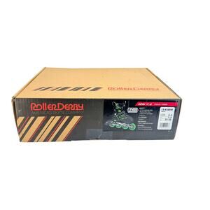 These Roller Derby ION 7.2 inline skates are perfect for growing kids and beginners looking for speed, comfort, and fun. Featuring EZ Push Button adjustable sizing (USA youth 2-5), deluxe comfort liner, and a locking cam-lever buckle for a secure fit. The aluminum chassis supports smooth rolling with 64mm front/rear and 70mm middle polyurethane wheels on carbon-rated Silver-5 speed bearings. These skates come in striking black and green with lightweight, durable construction. Model #I145BM, UPC 049288145134.
