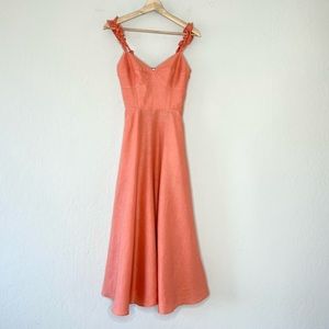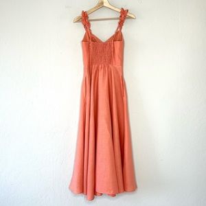Gorgeous peach pink 100% linen dress with ruffled adjustable shoulder straps and a flared midi hem. Bustier style top, smocked back, zipper closure, side pockets, unlined hem.