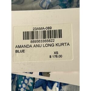 The Roller Rabbit Amanda Anu Long Kurta Dress in XS is a beautiful blue cotton maxi dress featuring a floral pattern and long sleeves with a V-neckline. The dress has a button closure and is machine washable. With a country peasant theme, this lightweight and sheer dress is perfect for parties or casual occasions during the summer and spring seasons. The dress also includes embroidered accents, a side slit, and is collarless, making it a versatile and stylish addition to any woman's wardrobe. Made in India by the Roller Rabbit brand, this dress exudes a cottagecore aesthetic.