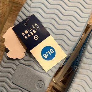 Roller Rabbit slide sandals with patterned paisley strap. Soft light blue footbed. Easy slip-on design. Lightweight and casual.New with tags size 9/10