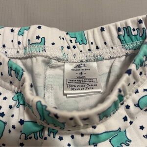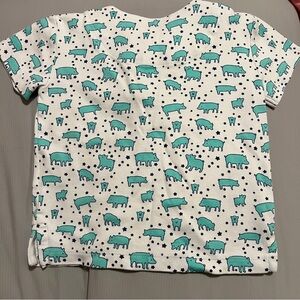 Soft short-sleeve tee by Roller Rabbit. White background with teal animal silhouettes. Scattered navy star accents. Lightweight cotton knit. Playful pattern for everyday wear. Size 4 Pima cotton.