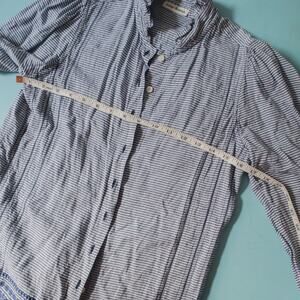 Features: Blue and white striped long sleeve button front ruffle neck cotton shirt with embroidered trim on hem and wrists.
