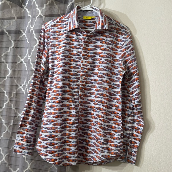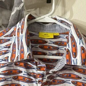 Roller Rabbit Button-Up size Small. Features orange and blue kayak print. Lightweight cotton fabric. Would be perfect for a lake or vacation trip! Striped, coordinating pattern I. Inside of neckline and sleeve cuffs.
