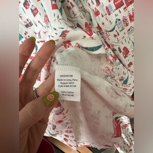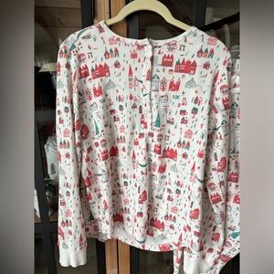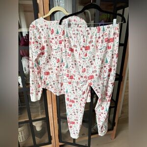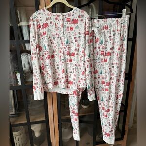 Cozy pajama set with playful red and green print. Long sleeves and full-length pants. Perfect for lounging.