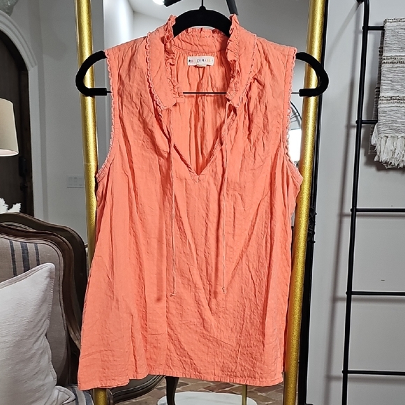 Bright, breezy, and effortlessly chic, this Roller Rabbit coral sleeveless blouse is the perfect warm-weather statement piece. The soft crinkled cotton, ruffle collar detail, and relaxed silhouette make it ideal for everything from beach days to brunch dates.