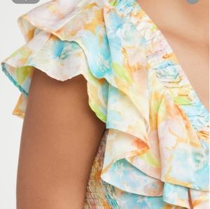 Gorgeous watercolor print dress with smocked back, flutter neckline. Sandrio Odine. I’m the only owner, have worn a few times, in great condition. Color is true to actual photos, stock photos for fit.