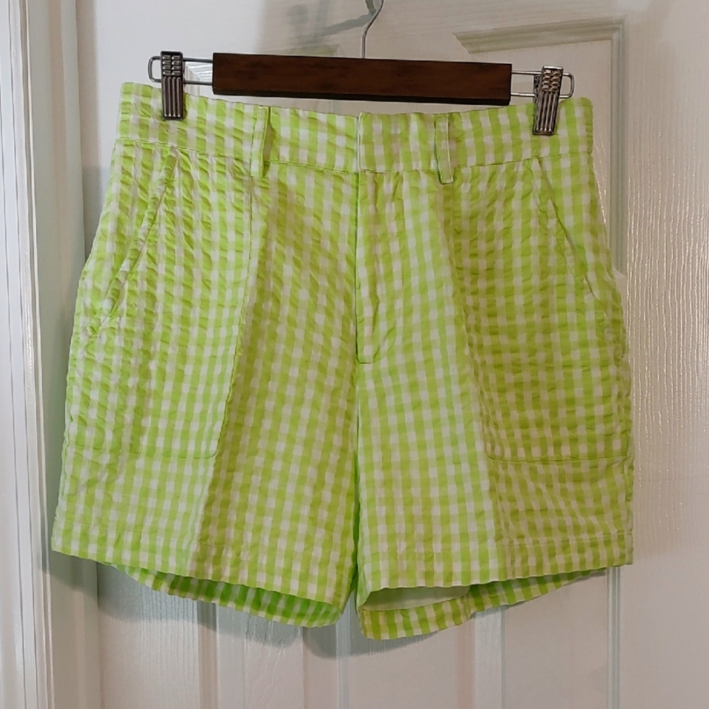 Stylish green gingham shorts perfect for casual outings. Enjoy comfort and style with these vibrant shorts. Front pockets. Elastic waist in back. Only wore once. Inseam measurement is 4 1/2". Fully lined.