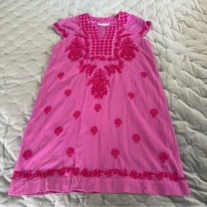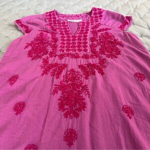 Vibrant fuchsia tunic featuring detailed floral embroidery. Ideal for stylish casual wear.