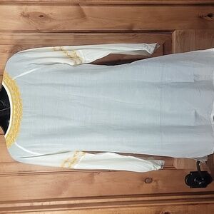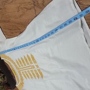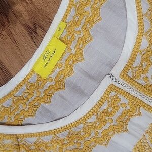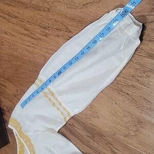 This elegant women's top features a beautiful yellow embroidery on soft white cotton silk blend fabric, perfect for any occasion. The intricate design adds a touch of sophistication to your wardrobe. Semi sheer as pictured. Excellent clean preloved condition. Generous XS fit with vented sides. Please see the measurements in the photos.