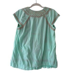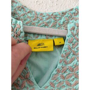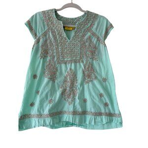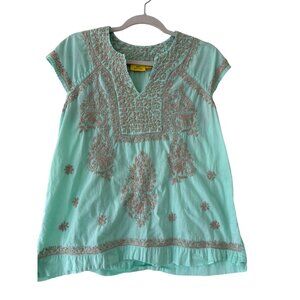 Roller Rabbit Embroidered Tunic Top V-Neck Short Sleeve Aqua Tan M