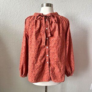 Roller Rabbit Eyelet Blouse Top in Terra. Beautiful red orange "rust" floral eyelet 100% cotton fabric. Button up back closure with adjustable back neck tie. Loose fit. Side slits. Lined. Made in India. *AI model depiction of style.