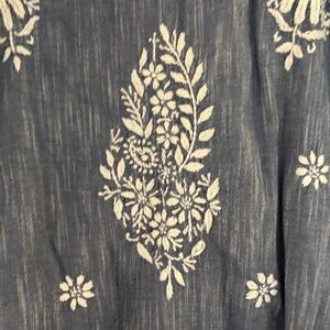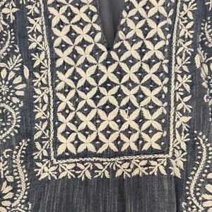 This dress is lightly lined and features a notched neckline with cap sleeves, and intricate embroidery throughout.