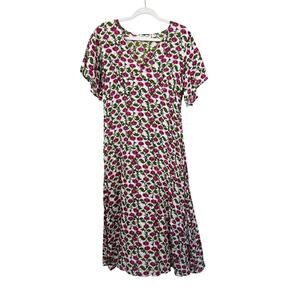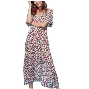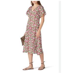 Express your feminine side with this swingy midi dress. Our Dakini Floral Issa Dress features a surplice neckline, flutter sleeves, and a bright floral print on a textured jacquard fabric. 100% Viscose. Machine Wash, Gentle Cycle. Line Dry. Made in India.