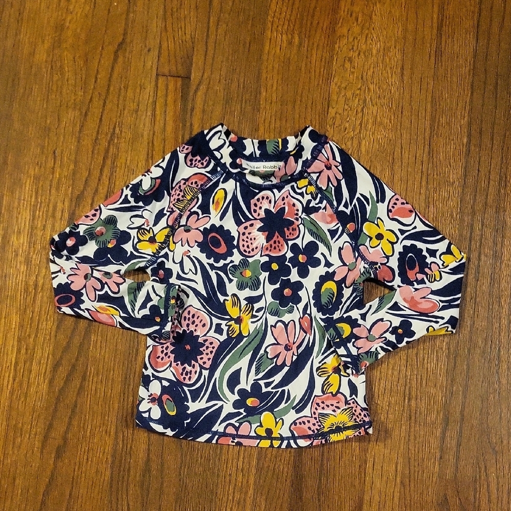 Colorful floral print top by Roller Rabbit. Features vibrant pink, blue, and yellow patterns.