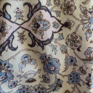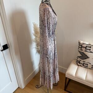 The Roller Rabbit Floral V-Neck Long Sleeve Maxi Dress in XS is a stylish and versatile option for summer and spring occasions. This dress features a beautiful floral pattern in cream, pink, and blue hues, with a flattering V-neckline and balloon sleeves for a bohemian feel. Made from lightweight viscose material, this maxi dress is easy to care for with machine washable instructions. Perfect for travel, casual outings, or beach-themed events, this dress offers a relaxed fit with adjustable ties for added comfort.