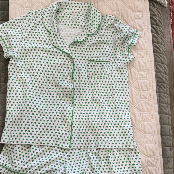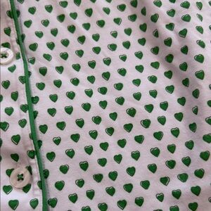 Adorable pajama set with green heart pattern. Short sleeves and button-up top. Comfortable and cute for bedtime.