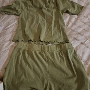 Comfortable green pajama set. Short-sleeve top with matching shorts. Soft and cozy fabric.