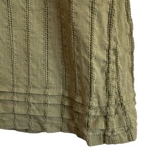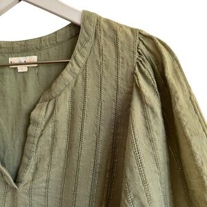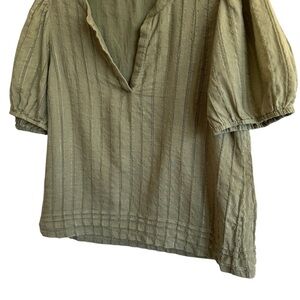 Super cute green top from Roller Rabbit. This has puff sleeves, textured stripes, and layered pleat details at the bottom. There is also a subtle sparkle from silver metallic threading throughout.