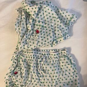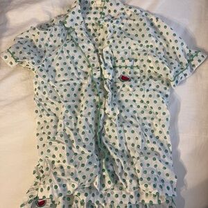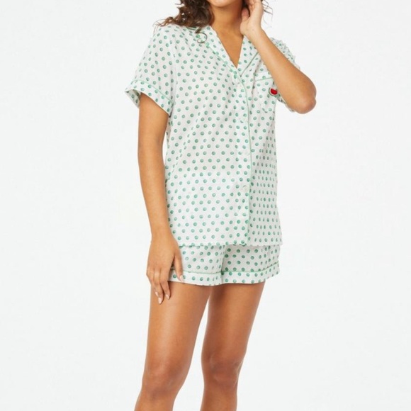 Stylish pajama set with a fun green and white design. Features a button-up top and comfy shorts.