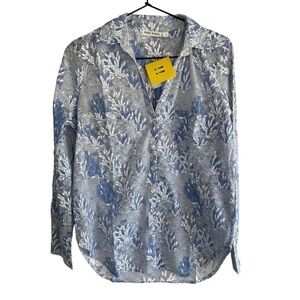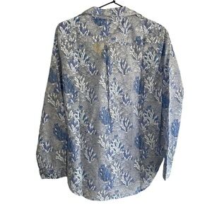Tags: Roller Rabbit, Guy shirt, Ugyen Leaves print, printed cotton shirt, button down, long sleeve blouse, casual top, boho style, blue white shirt, breathable cotton, lightweight top, women's shirt, resort wear, travel outfit, everyday blouse, relaxed fit, artisan print, block print style, spring fashion, classic silhouette, coastal chic, effortless style,