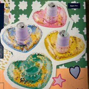 Set of four heart-shaped inflatable cup holders. Each holder features gold foil accents. Bright pastel colors for pool or party use. Easy to inflate and float.