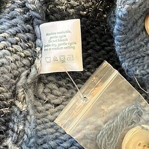 New; price tag was removed, but black cord is still attached to the label, and the spare button in baggie is still attached. This cozy oversized wool-blend cardigan features roomy side pockets, a button-up front, and an ombre stripe pattern in blue and silver metallic tones. 50% Cotton, 47% Virgin Wool, and 3% Polyester.