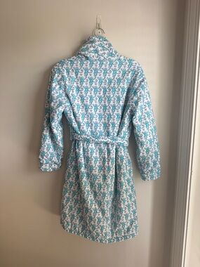 Cozy robe with playful monkey print. Aqua and lilac pattern on white fabric. Light piping details for contrast. Cheerful and whimsical design.
