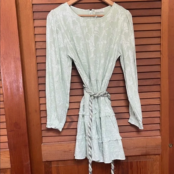 Roller Rabbit long sleeved mini dress. Elastic at wrist. Minty green with silver metallic embroidery and braided sash belt. Lightweight and fully lined. Back zip with hook and eye closure. Absolutely beautiful dress!
