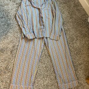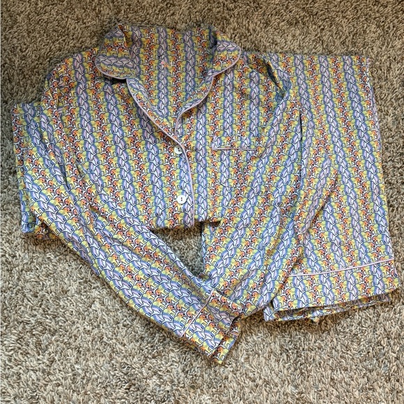 Vibrant pajama set with playful pattern. Long sleeves and button-up top. Comfortable and stylish for sleepwear.