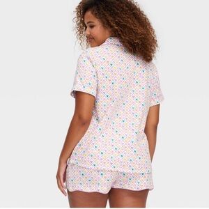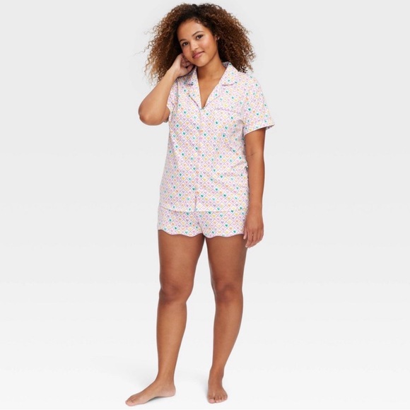 Short-sleeve pajama set with playful multicolor print. Button-up top with matching shorts. Comfortable and stylish for sleepwear.