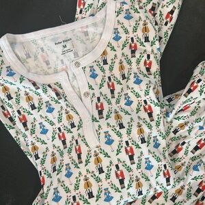 Charming pajama set with playful multicolor print. Soft fabric for comfort. Button-up top with matching pants.
