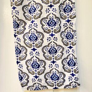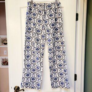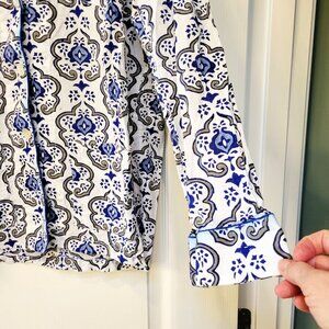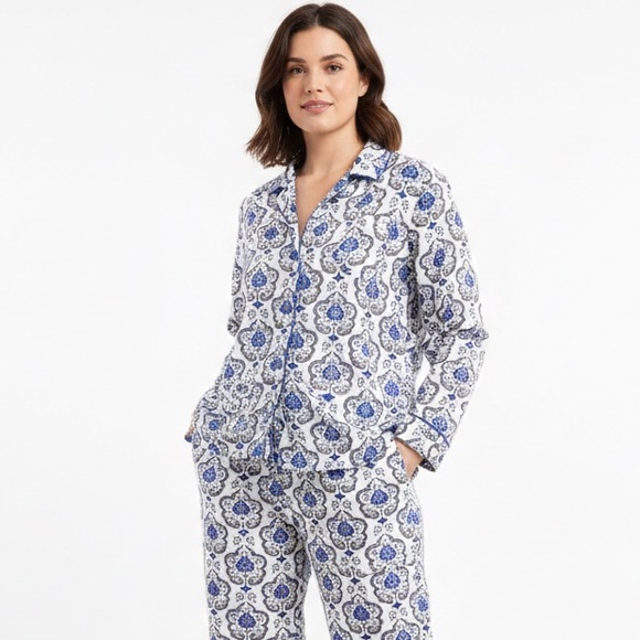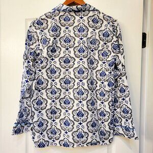 Roberta Roller Rabbit linen-type pajama set. Stylish pajama top with intricate blue and black pattern. Button-up front. Soft and comfortable fabric.