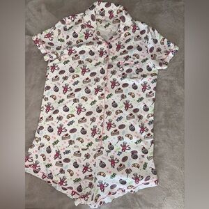 Sweet Dreams charming pajama set with dessert motifs. Features monkeys, cakes, donuts, candies and croissants with pink trim.