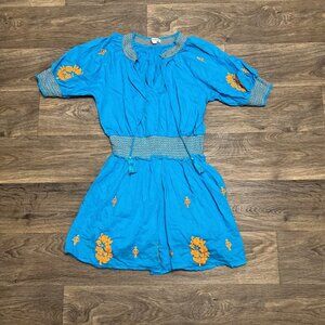 Roller Rabbit Paraiso Fiorella Dress Turquoise Blue Orange Embroidered Sz Medium