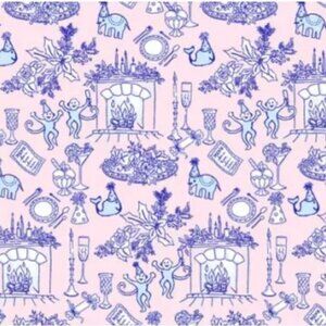 Fun pastel purple, blue, & white winter party pattern with monkeys, whales (Moby), elephants (Hathi), dinner plates, shrimp cocktails, wine glasses, fruit, candles, ice cream bowls, & fireplaces on a pink background.