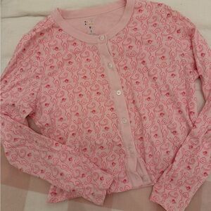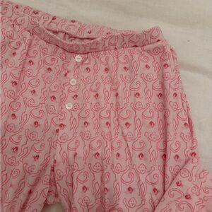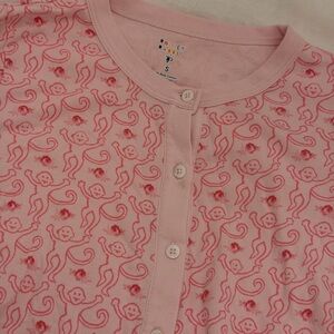 Light pink button-front pajama top with playful paisley and monkey motif. Soft knit fabric and rounded neckline. Casual, cozy sleepwear staple. SO SOFT and cute!!! Slight stain on top in picture