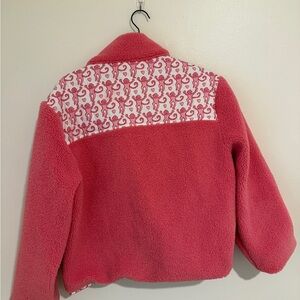 Cozy pink sweatshirt with white patterned accents. Features a high collar and front pockets.