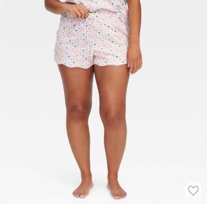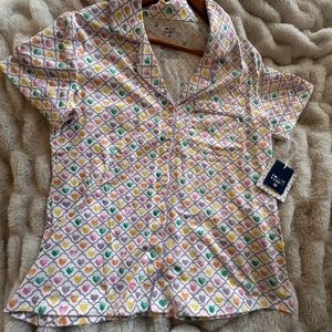 Button-front short-sleeve top with matching elastic waist shorts. Soft, lightweight fabric for lounging and sleep. Allover small heart and diamond print in bright colors.
