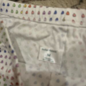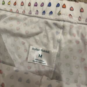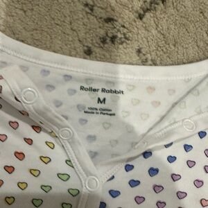 Charming pajama set with multicolored heart pattern. Features a button-up top.