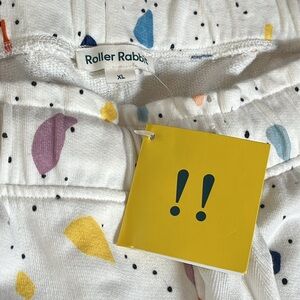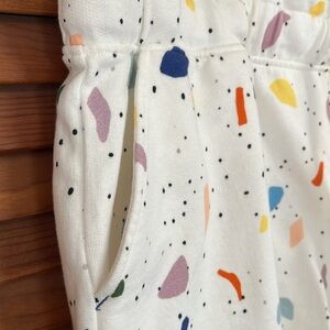 Roller Rabbit paper bag waist shorts - elastic and drawstring combo. 100% cotton French terry fabric. Deep pockets. Multicolored abstract pattern on white background.