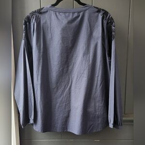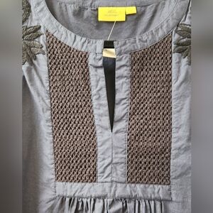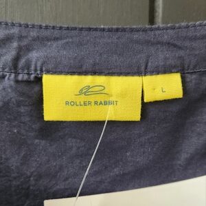 Roller Rabbit Navy Smock Top, has beautiful floral embroidery in black on the shoulders, V neck with black trim along the side. pleating at bottom, hangs to top of thighs, a very distinguished piece.