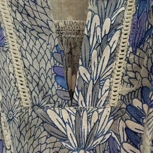 The Roller Rabbit Sz. L 100% Cotton Tie Neck Popover Top is a stylish and comfortable tunic-style blouse made of lightweight and breathable cotton fabric. Featuring a V-neckline with tie closure and 3/4 sleeves. The geometric pattern and pleated accents add a touch of bohemian and peasant flair to the top.