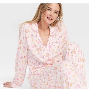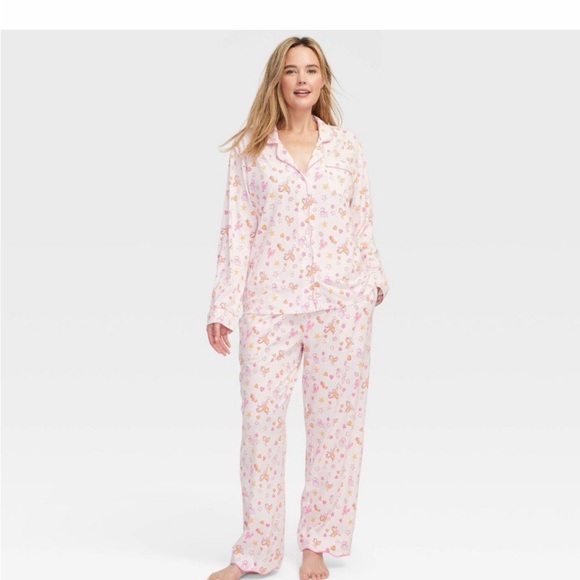 Light pink pajama set with a delicate floral all-over print. Button-front long-sleeve top with matching relaxed pants. Soft, breathable fabric for lounging and sleep.