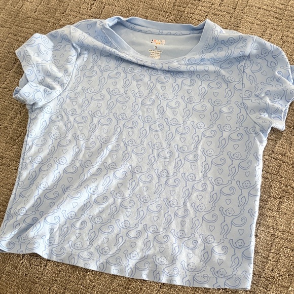 Light blue short sleeve tee with playful monkey design. Soft fabric for comfort.